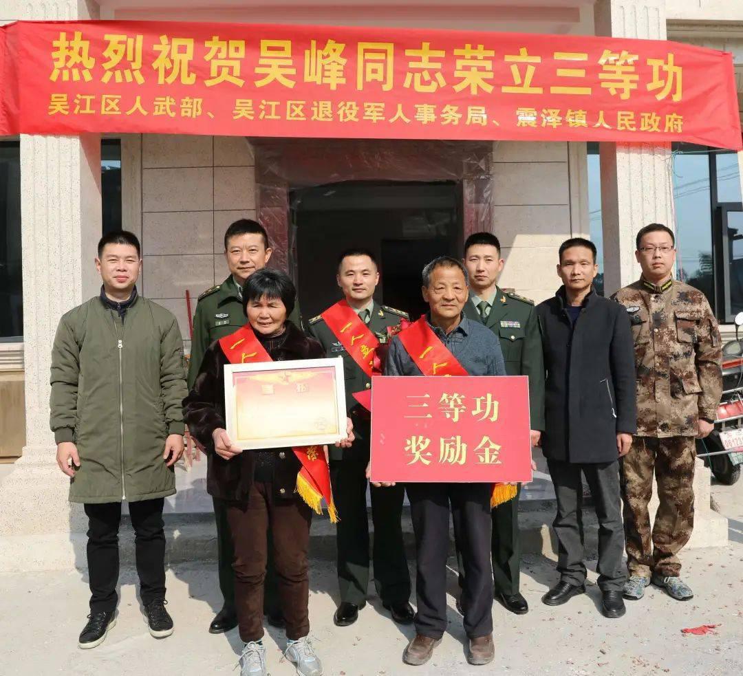 2月1日,吴江区人武部、区退役军人事务局为荣立三等功的孙雄飞、吴峰、彭良典、周佳宇、徐宏、顾晨煜家庭送去立功喜报和立功奖励金,并致以热烈的祝贺。 在震泽镇花木桥村,伴着热烈的锣鼓声,送喜队伍将立功喜报一路送到吴峰家中,邻居们得知消息后,纷纷来...