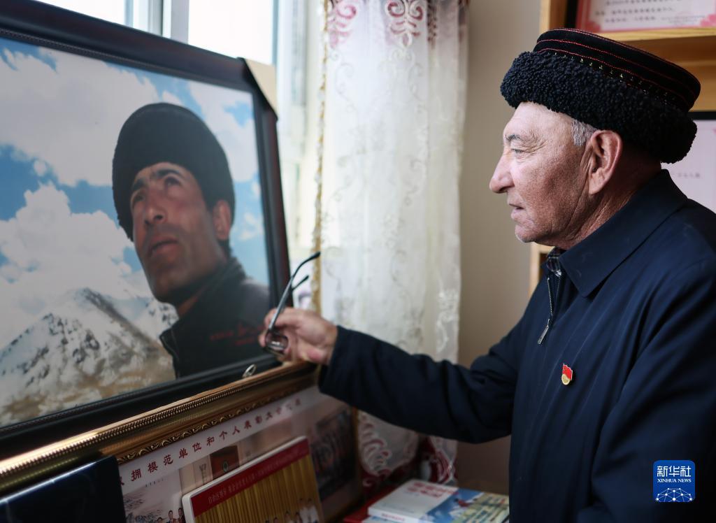 9月4日,巴依卡老人抚摸儿子拉齐尼的照片。 在祖国西陲的新疆塔什库尔干塔吉克自治县,9月正是旅游旺季,各地游客络绎不绝,不少游客前往时代楷模拉齐尼巴依卡生前的家参观慰问。拉齐尼的父亲71岁的巴依卡凯力迪别克老人时常会向大家介绍他们一家三代人守边...
