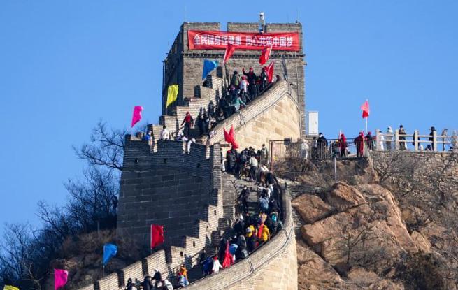 1月1日,人们登北京八达岭长城。新华社记者 鞠焕宗 摄 当日,2023年全国新年登高健身大会北京会场活动在八达岭长城举行,300余名市民代表和众多游客一起,登高望远,健身祈福,庆祝新年。 1月1日,两名来自广东的游客(前中)登北京八达岭长城。新华社记者...