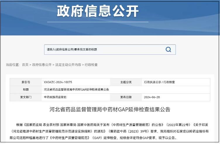 6月28日,河北省药品监督管理局发布《河北省药品监督管理局中药材GAP延伸检查结果公告》称,河北省药品监督管理局组织对石家庄以岭药业股份有限公司连翘种植基地进行了《中药材生产质量管理规范》(GAP)延伸检查,经综合评定符合GAP要求。 据悉,根据《国家药...