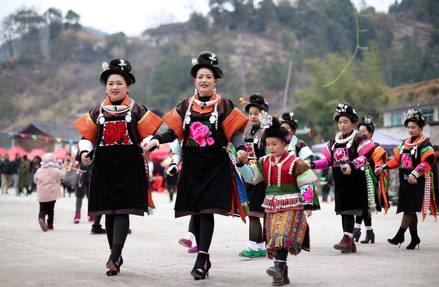 春节将至,贵州省黔东南苗族侗族自治州丹寨县兴仁镇岩英苗寨迎来传统苗年,苗族同胞们身着节日盛装,在芦笙场上欢跳芦笙舞、铜鼓舞,欢度苗年迎新春。黄晓海摄(人民图片网)...