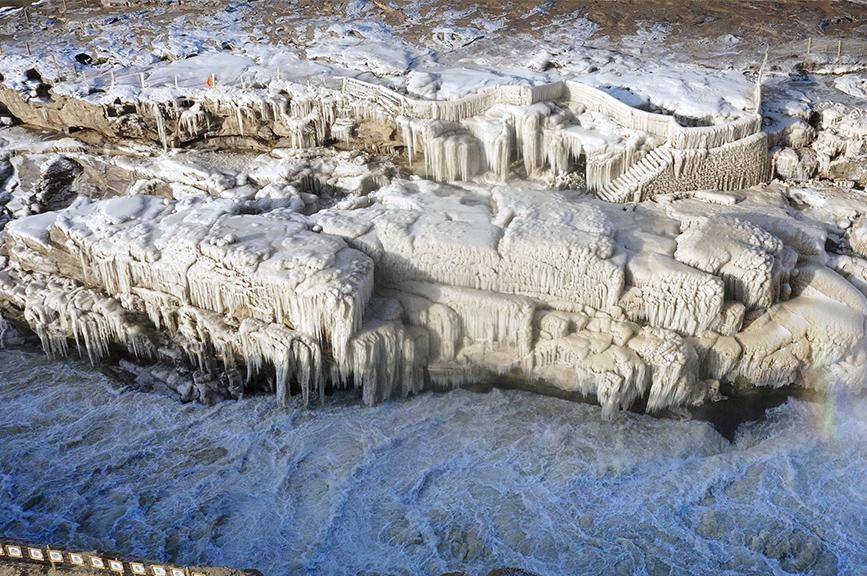 近日,降温寒潮解锁了冰瀑美景,黄河壶口瀑布迎来冬日最佳观赏期。瀑布激起水雾,在寒风中顷刻结冰,百尺偏瀑银装素裹,冰峰倒挂晶莹奇巧,层层叠叠的冰瀑与彩虹交相辉映,形态各异无比壮观。(张旦摄)...