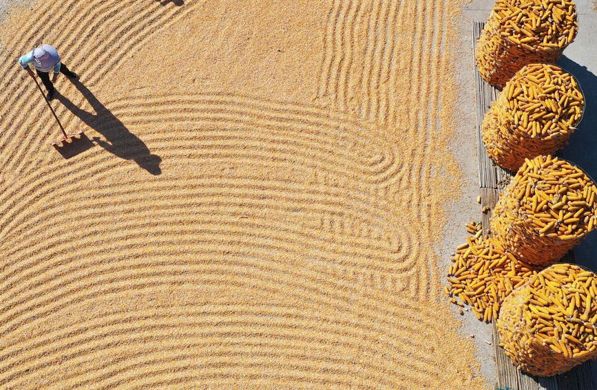 10月9日,甘肃省定西市安定区青岚山乡大坪村农民在晾晒玉米。 农业农村部最新农情调度显示,截至目前,全国秋粮已收获6.72亿亩,进度已达51.5%。 新华社发(王克贤摄)...