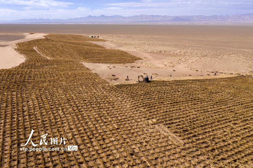 2022年8月10日,在海拔3000多米的甘肃省酒泉市阿克塞哈萨克族自治县境内的祁连山国家公园,治沙人员在荒无人烟的沙丘上用稻草开展压沙治沙,对局部退化严重的草原进行草方格沙障治理,维系草原生态环境。 近年来,甘肃阿克塞哈萨克族自治县不断加大祁连山国...