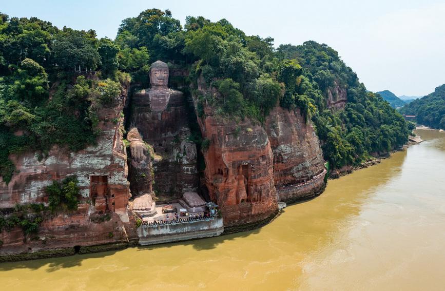 近期,持续高温晴热天气使四川省多地出现不同程度的旱情,长江上游的主要支流岷江、青衣江和大渡河三条水系的上游来水均少于往年同期,导致乐山大佛前方的三江汇流处水位持续降低,部分河床与江滩裸露,乐山大佛罕见露出底座。(作者:沈伯韩)...
