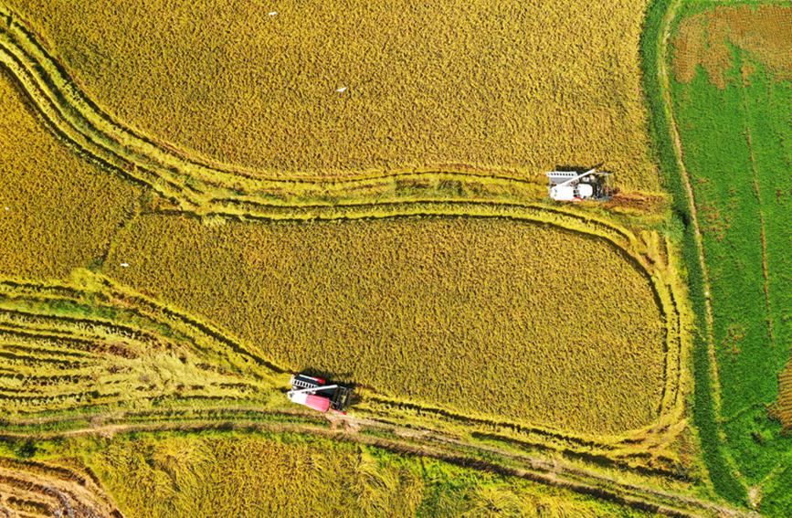 江西省樟树市阁山镇种粮大户在田间收割水稻。处暑时节,樟树市中稻迎来丰收季,当地农户利用晴好天气抢收粮食,确保颗粒归仓。据了解,当地今年中稻种植面积5.86万亩,预计粮食总产量可达3.25万吨。(作者:毛思远、杨松)...