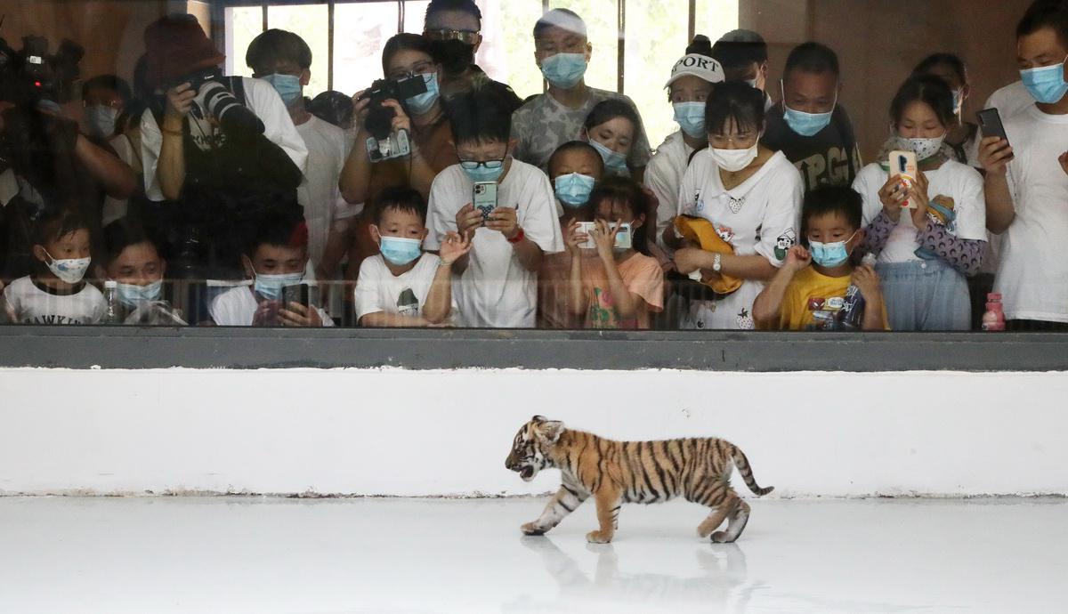 7月11日,中国华南虎苏州培育基地的一只雌性小华南虎首次与游客见面,萌态十足。这只小华南虎出生于2022年4月29日,目前生长情况良好。(作者:杭兴微)...
