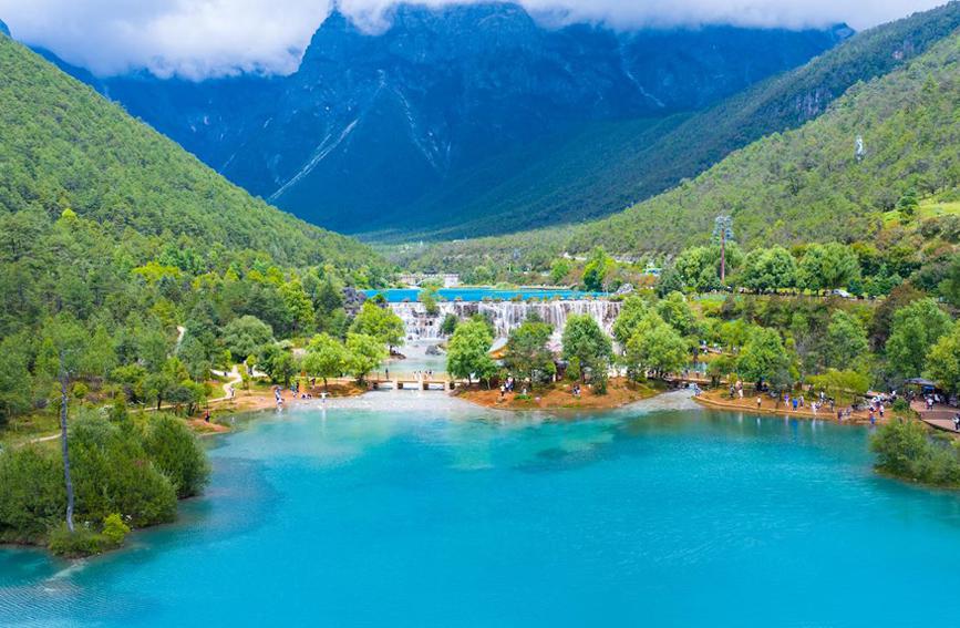 夏日的蓝月谷湖水蓝如宝石、晶莹剔透,山间树木苍翠、郁郁葱葱,白云连横浮于山际、倒映在湖面,如梦幻影,仿若仙境。蓝月谷风景区位于云南省丽江市玉龙雪山东麓,因湖水湛蓝,山谷呈月牙状而得名。(作者:杨文明、蔡树菁)...