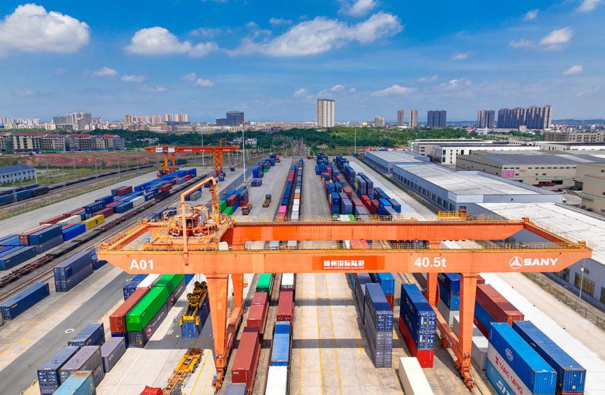 2022年7月21日,在江西省赣州国际陆港货场,龙门吊起重机正在吊运集装箱货柜,货车装卸作业来来往往,现场呈现一派繁忙景象。(作者:胡江涛)...