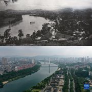 拼版照片:上图为1978年时百色市右江河畔面貌(资料图片,百色市档案馆提供);下图为2022年5月8日拍摄的百色市右江河畔面貌(新华社记者张爱林摄,无人机照片)。 南疆五月,左右江畔,生机勃发。地处我国西南的左右江革命老区老少边山特点突出,近年来,伴...