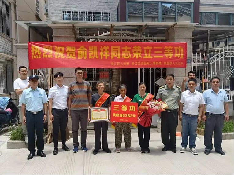 日前,吴江区人武部、吴江区退役军人事务局、同里镇一行为文厍村荣立“三等功”的现役军人俞凯祥家属送去立功喜报和慰问金。