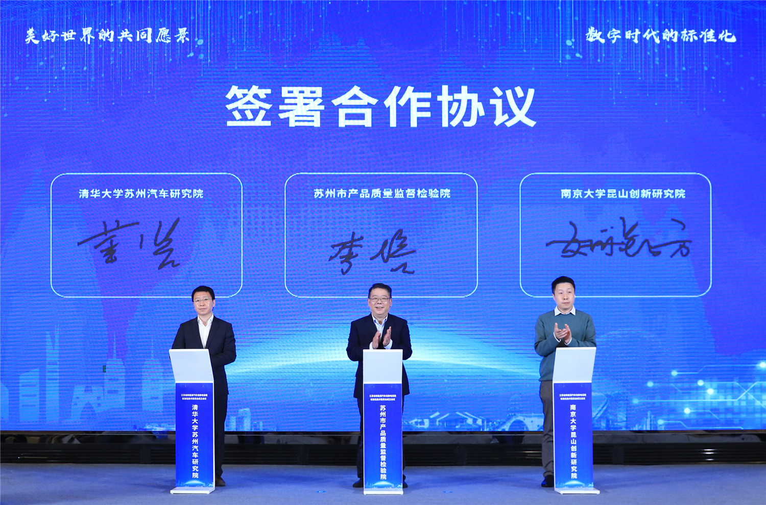 会上,清华大学苏州汽车研究院、南京大学昆山创新研究院、苏州市产品质量监督检验院签署合作协议,三方将共同探索建设合作载体,开展相关领域的标准化创新研究。