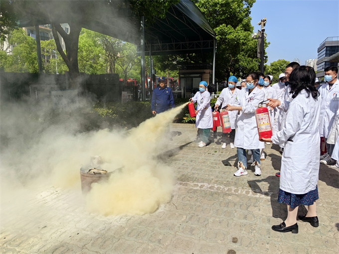 活动中,消防救援队中队长范高源还对医院火灾预防、火场自防自救、逃生疏散、消防器材使用等消防知识进行了详细的分析讲解。在消防员的指导下,参训人员使用干粉灭火器、消防水枪等消防设备进行现场灭火演练。