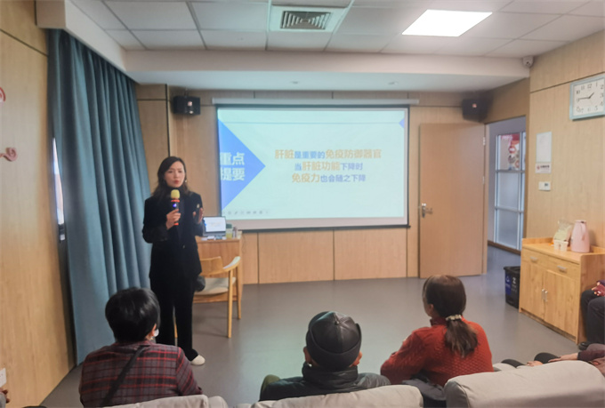 本次讲座,讲师用通俗易懂的语言向大家讲解了春季养肝护肝的重要性以及肝脏疾病的预防方法,让现场居民对肝脏疾病有更加全面的认识和了解,居民们听得聚精会神,有的居民认真地记起了笔记。讲师提醒大家在日常生活中要多观察自己身体状况,向现场居民提出了合理膳食、适量运动、戒烟限酒、控制体重、心理平衡等建议,提醒老人要定期进行身体健康检查。居民李阿姨表示,今天听了干货满满的一堂课,回去后会认真研究课上的笔记,掌握春季养生护肝的正确方式。活动现场,社区海棠先锋志愿者们充分发挥党员先锋模范作用,向居民们发放了健康知识宣传单,为前来听讲座的老人提供了热情周到的服务。