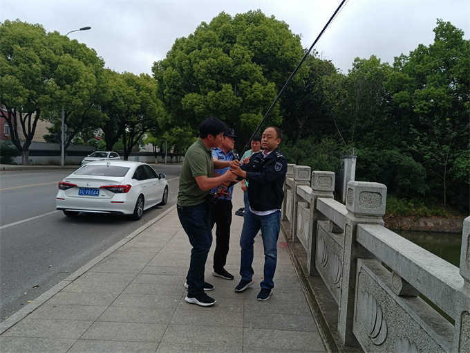 随后,社区工作人员、属地警务室警务人员、网格员联合街道渔政科工作人员共出动10余人在辖区水域进行巡查,发现阳澄湖东路中兴桥有一男子正在使用鱼竿钓鱼,仔细观察,发现他的鱼竿上安装有类似视频的装置,于是赶紧上前查看,将正在使用视频竿锚鱼的男子抓了个现行。现场查获可视视频锚鱼竿一套和一条鱼,并对当事人进行批评教育。