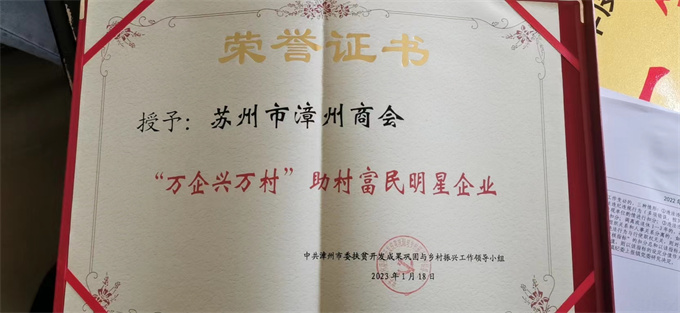 1月18日,漳州市委农村工作会议在漳州宾馆召开,会上,表彰了2022年度一批漳州市乡村振兴先进单位和先进个人,苏州市漳州商会等14家企业(商会)被授予“万企兴万村助村富民明星企业”称号。