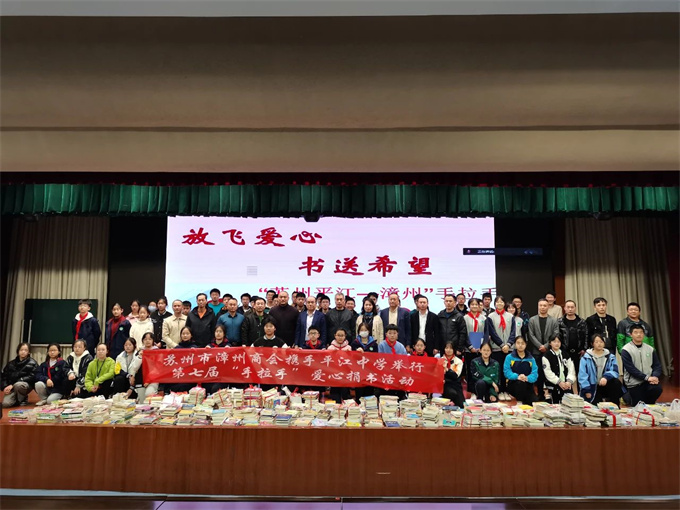 3月22日中午12:30,苏州市漳州商会携手平江中学以线上线下相结合的方式,连线接受捐赠的漳州第一中学芝山校区举行第七届“平江—漳州手拉手”爱心捐书活动。漳州市教育局四级调研员杨国和,漳州市教育局体卫艺语科科长林海宁,漳州市第一中学芝山校区校长代表、老师代表、学生代表,苏州市平江中学副校长顾勇飚、施金锋,学生处主任王阳,老师代表,学生代表,以及商会常务副会长韩为国,秘书长陈双红,副会长李英杰、陈勇平、梁瑞滨、陈国卿、薛金兴,理事陈文胜,会员曾龙煌、林寿溪、杨辉荣、郑伟平等300多人参加。