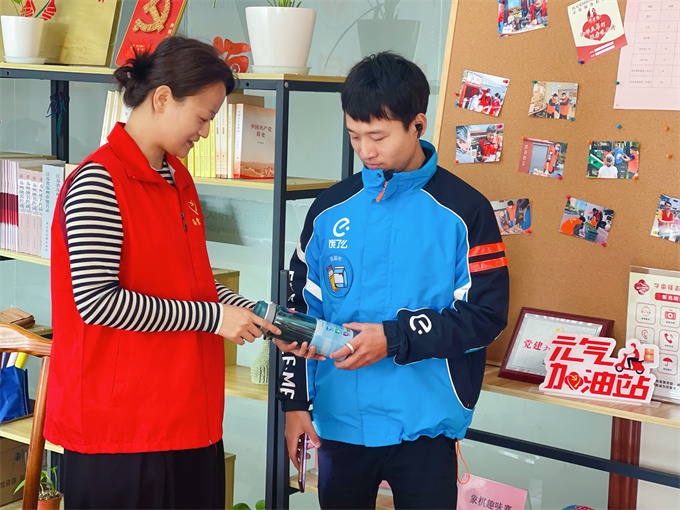 “以前没订单的时候,只能趴在电动车上玩手机,手机没电了就急得团团转,得到处找地方充电,很不方便。现在好了,社区里面建了一个元气加油站,累了能歇脚、渴了能喝水,还能充电、避雨,确实是方便了我们很多!”在庆元家园社区的元气加油站里,正在给手机充电的外卖小哥刘师傅对此赞不绝口。在充电间隙,工作人员还贴心地为刘师傅测量了血压并为他送上了运动水壶,叮嘱他天气渐热,在送餐的时候要注意及时休息补充水分以免中暑,工作人员的贴心服务令刘师傅感到十分暖心。整个活动陆陆续续有10余名外卖小哥参与并领取了服务礼包。