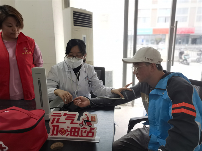 立夏过后气温逐渐上升,考虑到新业态新就业群体工作的特殊性,近日,朱巷社区党委联合元和卫生院为新业态新就业群体开展义诊服务。为了不耽误快递、外卖小哥的工作时间,社区特设两个义诊点,一是社区党群服务中心门口,另一个则是辖区内一个外卖休息站。刚刚结束订单任务的外卖小哥张师傅一跑进休息站,就来不及脱下帽子,撸起袖子说:“今天真是巧了,最近天热又跑的多,我平时有高血压,正想着啥时抽空去测个血压看看呢。”医生耐心地告诉他为了保证测量的正确性,建议他先静坐休息5分钟再进行测量,期间详细告知张师傅高血压人士在日常生活中的注意事项。本次义诊共为近20名快递、外卖工作人员提供量血压、测血糖、日常保健咨询等服务。
