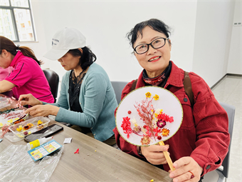 团扇,又称宫扇、执扇,是中国汉族传统工艺品及艺术品,它代表着团圆友善、吉祥如意。中国扇文化有着深厚的文化底蕴,是民族文化的一个组成部分。活动现场,花艺老师从花材、构图、搭配等方面指导大家如何做出一把精美的干花团扇作品,并鼓励居民们在承袭传统的同时融入创新,加入不同的手工装饰,成就属于自己独一无二的艺术品。大家跟着老师的示范,纷纷动手制作起来,原本空白的素扇瞬间缤纷多彩、花团锦簇,整个活动室充满了欢乐的气息。在这个暮春浅夏的五月,让我们放慢脚步,让温暖的阳光撒进心扉,用心绘一把清新团扇,在其乐融融的氛围中,以最真挚的心表达对母亲永恒的爱意和祝福。活动结束后,大家拿着自己做好的团扇相互展示拍照,合影留念,度过了一个温馨、快乐的母亲节。