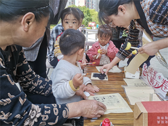 滴滴!“流动图书车”来了,广场上大家纷纷聚集在车旁,拿起书籍阅读。小朋友们在一旁拿起方方正正的字块摆弄,青年团员志愿把活字印刷的材料分发给小朋友们,小朋友们通过排版、刷墨、铺纸、拓印,一手按住宣纸,一手用拓盘均匀压印宣纸,让油墨逐渐吸入到纸张,不一会一张张晕满墨香的唐诗《悯农》完成了。“锄禾日当午,汗滴禾下土”社区志愿者通过阐述唐诗《悯农》让未成年人要懂得珍惜粮食,体恤劳动的艰辛,感受劳动果实来之不易,引导未成年人从小树立节约粮食、拒绝浪费的意识,争做节粮爱粮小先锋,传递勤俭节约的家风家训。
