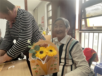 在活动一开始,社区志愿者们先给在场参与的大家发放了制作康乃馨的材料包,由于老人们年纪比较大,打开材料包都无从下手,志愿者们耐心的给大家一步步的讲解、指导:首先把花袋的表面粘起来,接着将配好的向日葵和郁金香的花朵部分和花杆部分连接起来,把花朵放进小袋子里,一个个漂亮的花袋就完成了。这个花袋不仅仅是个美丽的花袋,在花袋的背面还是张卡片,志愿者贴心的为每位老人写上了名字,并且写上了节日寄语,一个个普通的花袋变得更有意义,每个奶奶都拿到了专属于自己的节日祝福。活动在奶奶们的欢声笑语中进行着,大家一边制作花袋一边积极地指导身旁还不是很熟悉制作过程的伙伴。