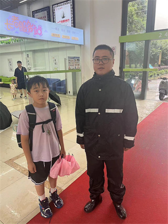 在姚祥社区,网格员积极救助暴雨中躲雨的孩童,用巡巡逻车护送老人小孩回家。