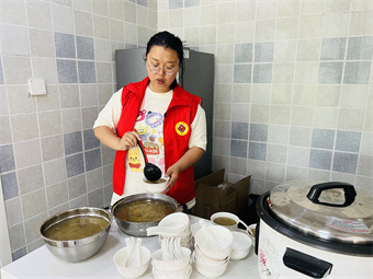一大早,志愿者就开始忙碌起来了,清洗锅盆、绿豆、百合,慢慢熬炖,考虑到老年居民牙口不好,有些老人高血糖,志愿者们就把绿豆煮烂一点,少放冰糖,熬制了将近三个小时。