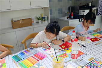 在建元社区融“i”空间综合活动中心,一场属于小朋友们的创作正热火如荼进行着,只见有人手中铅笔如有神助,三下五除二便打出一个草稿,有人却眉头紧锁,费心思考着从哪里下手,还有人专心致志勾勒着画中的细节,不一会一个栩栩如生的党徽跃然纸上......起型、勾线、上色,在志愿者和指导老师的帮助下,小朋友们积极努力完成着自己的创作。不论是水彩,亦或是油画棒,每一种上色工具在小朋友们手里好似被赋予了生命,在纸张上跃动着,如同踮着脚尖的芭蕾舞者留下令观众心动的美丽足迹。