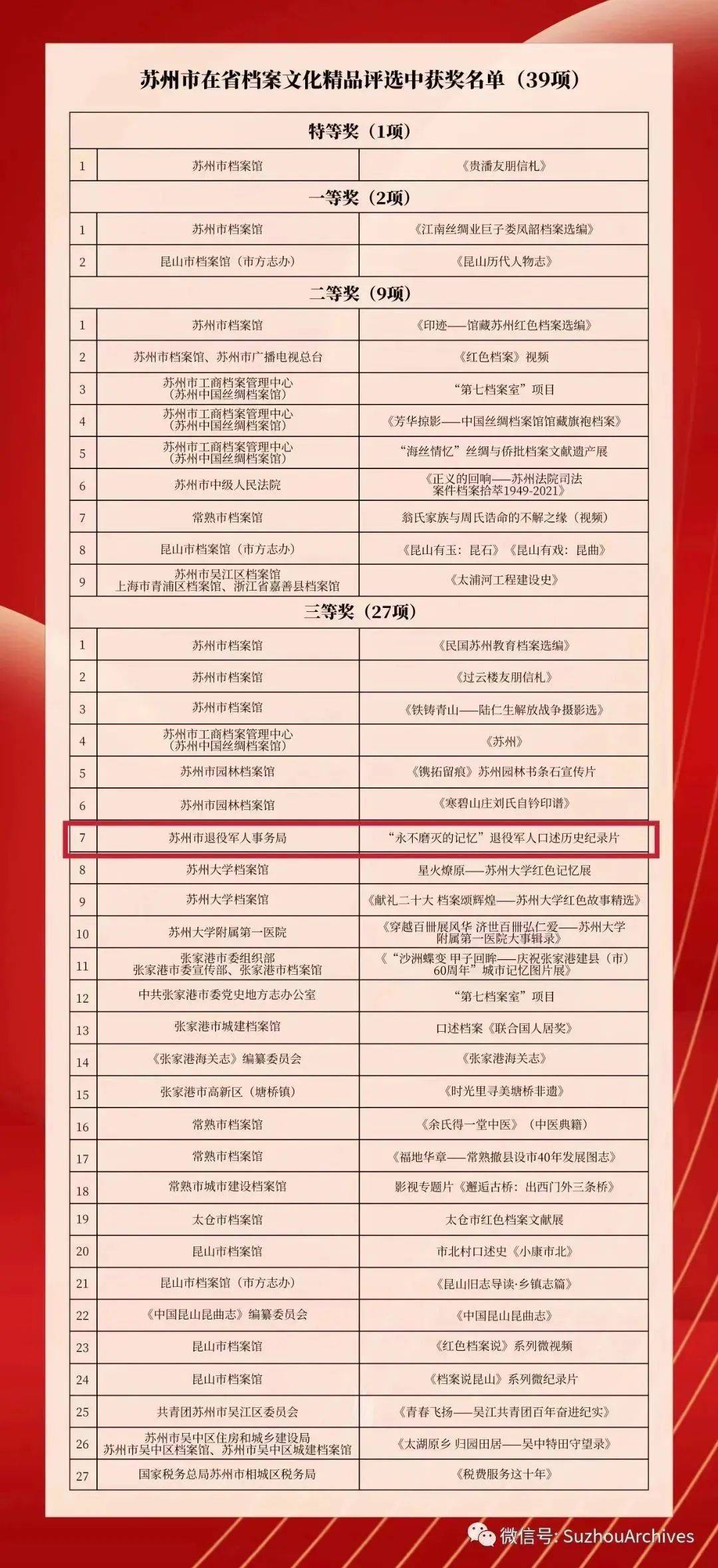 在省档案局、省档案馆组织开展的2023年度全省档案文化精品奖评选中,苏州市退役军人事务局选送的“永不磨灭的记忆”退役军人口述历史纪录片获评三等奖 。
