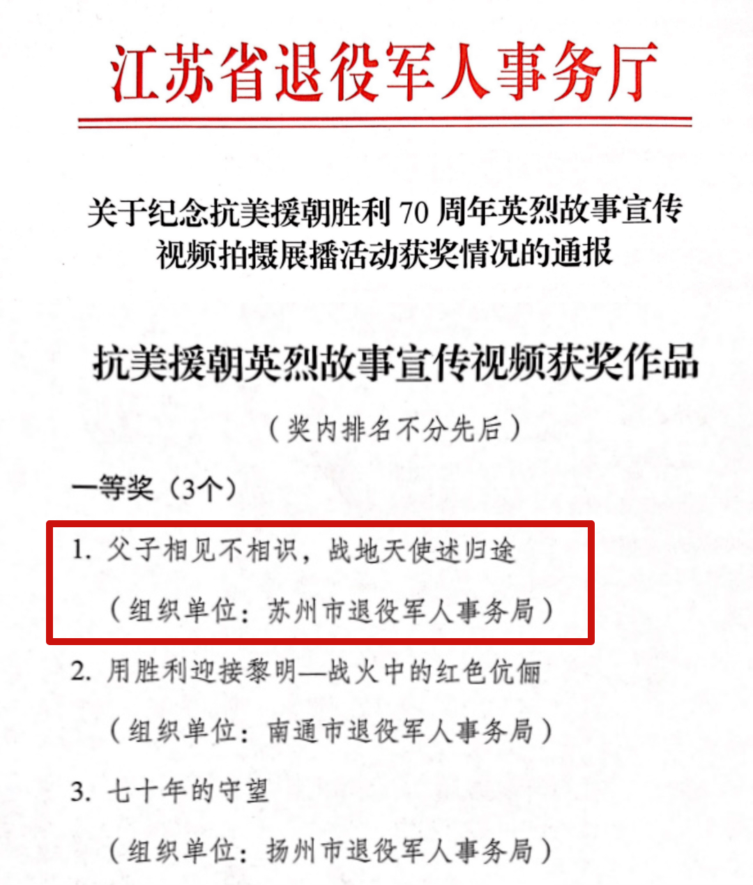 近日,在省退役军人事务厅主办的纪念抗美援朝胜利70周年英烈故事宣传视频拍摄展播活动中,军休干部姜天龙的“口述历史”视频 《父子相见不相识,战地天使述归途》获评一等奖。