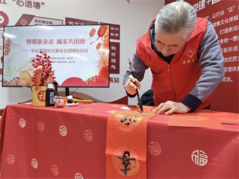 据了解,为了这场团圆饭活动,一早华辰嘉园社区的新时代文明实践志愿者就忙活了起来,买菜、洗菜、切菜、炒菜,青年团员则在直播间进行新年氛围布置。活动中,党员志愿者俞老伯挥毫泼墨,将一张张喜气洋洋的“福”字和一副副寓意吉祥的春联赠送给美团外卖小哥、直播人员。大家围坐一圈,就好似在家里一样,一起包馄饨、一起吃着热腾腾的团圆饭,畅谈各自家乡年俗文化,每个人的脸上洋溢着幸福的笑容。