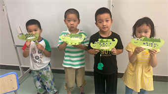 幼儿美学课中,老师让孩子们用卡纸做各种形象的小动物。老师先将做好的成品给小朋友们展示,小朋友们学着老师的制作步骤,不一会儿,一只只色彩斑斓鳄鱼就出现了。该课程既培养孩子们的动手动脑能力、记忆力、想象力、创造力。