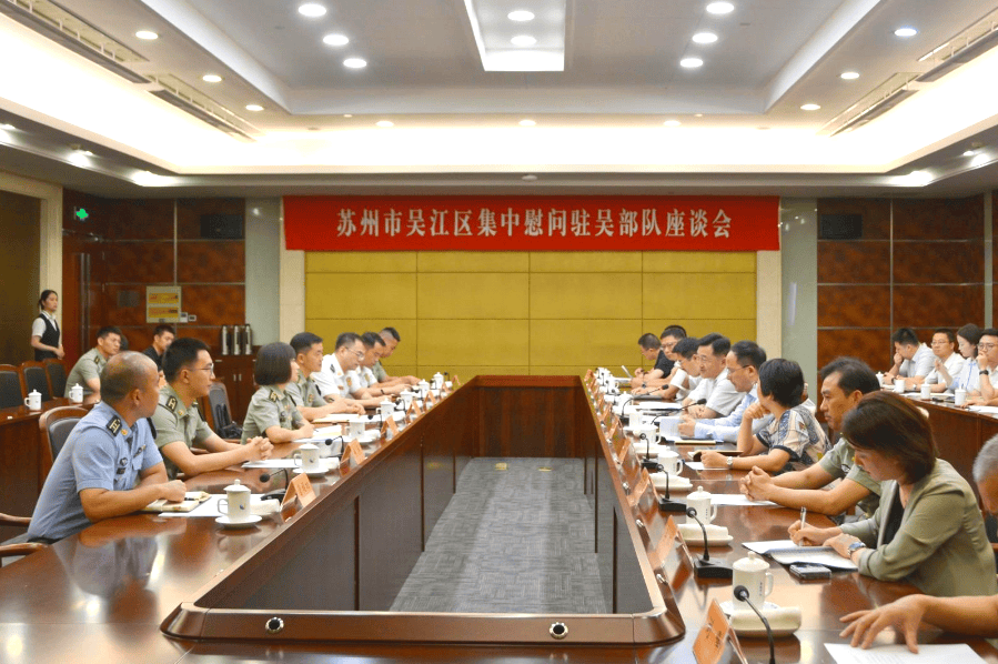 7月31日,吴江区集中慰问驻吴部队座谈会在区会议中心召开,庆祝中国人民解放军建军97周年,共叙军民团结鱼水深情,共商军民共建发展大计,携手谱写军民融合发展新篇章。区委书记李铭出席会议并讲话,区委副书记、区长王国荣主持会议,区人大常委会主任钱斌、区政协主席曹雪娟出席会议。