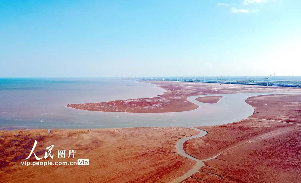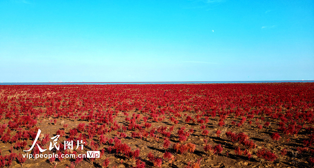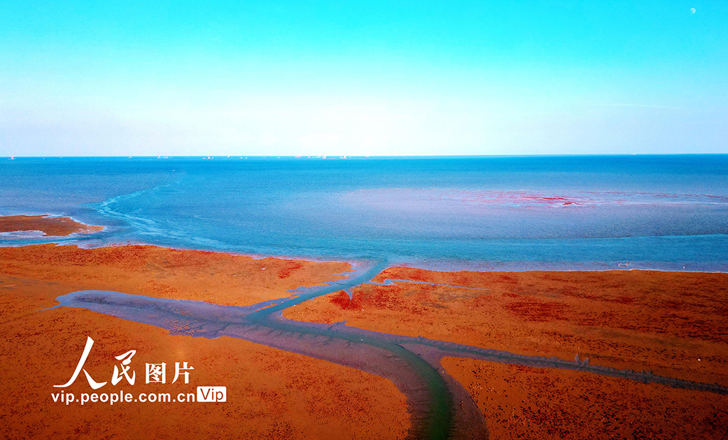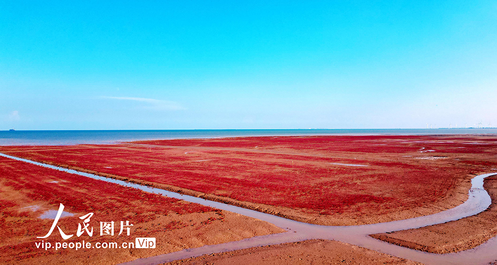 山东省东营市是全球首批“国际湿地城市”,拥有我国暖温带保存最广阔、最完善、最年轻的湿地生态系统。立秋后,生长在滩涂上的大片盐生植物由绿转红,远远望去火红一片,宛若一块巨大的红地毯。刘智峰摄(人民图片网)
