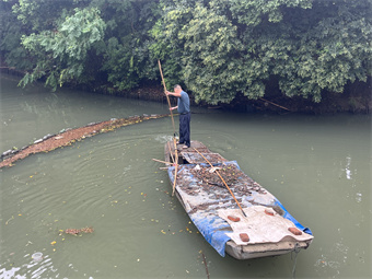 三伏天,气温攀升导致河道水草、浮萍杂生,增加了河道保洁工作的难度,为维护好水环境洁净美观,河道保洁人员对河道进行“拉网式”河道清理。保洁人员每日划着小船,在自己的包干区巡逻,及时清理岸边杂草,修剪水生植物,打捞浮萍及各种水上漂浮物,不放过任何卫生死角。针对水草季节性易发多发的特点,立足于防早、防小、防外,对区域内河道开展常态化清理,做到发现一处、打捞一处、保洁一处、常捞常清。尽管酷暑难当,但河道保洁人员依然坚守岗位,确保工作高效推进。他们表示,“通过及时清理水里垃圾,河水变得更为清澈,附近村民生活用水也更方便!”