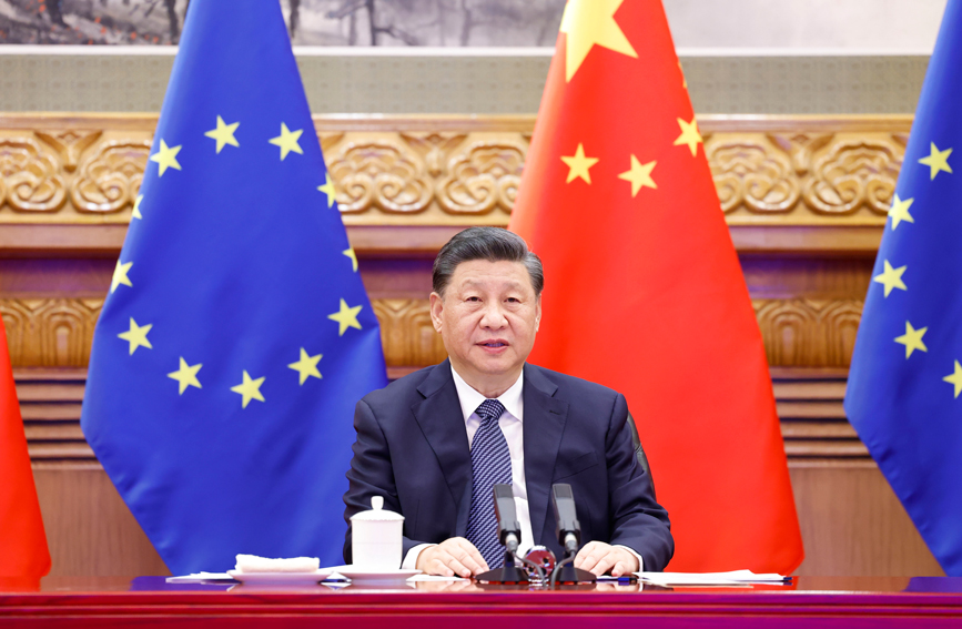 4月1日晚,国家主席习近平在北京以视频方式会见欧洲理事会主席米歇尔和欧盟委员会主席冯德莱恩。(作者:黄敬文)