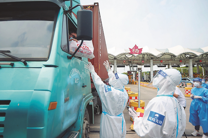 以“同心抗疫 我们在行动”为主题的货车司机关爱活动最近在我省多地开展,志愿者们为货车司机送去“抗疫爱心包”,提供暖心服务。图为20日,在南京绕城高速栖霞收费站出口,志愿者向货车司机送上“抗疫爱心包”。(作者:陈俨)