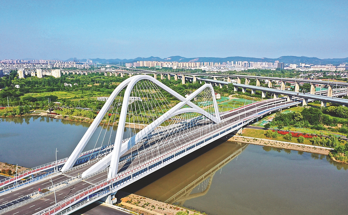 外观犹如巨型“蝴蝶结”的南京秦淮湾大桥,目前已进入竣工验收阶段,预计将于9月正式投用。大桥连接南京绕城高速和南部新城,为市民前往南部新城提供更便捷的路线。 通讯员 李琦 本报记者 赵亚玲 摄