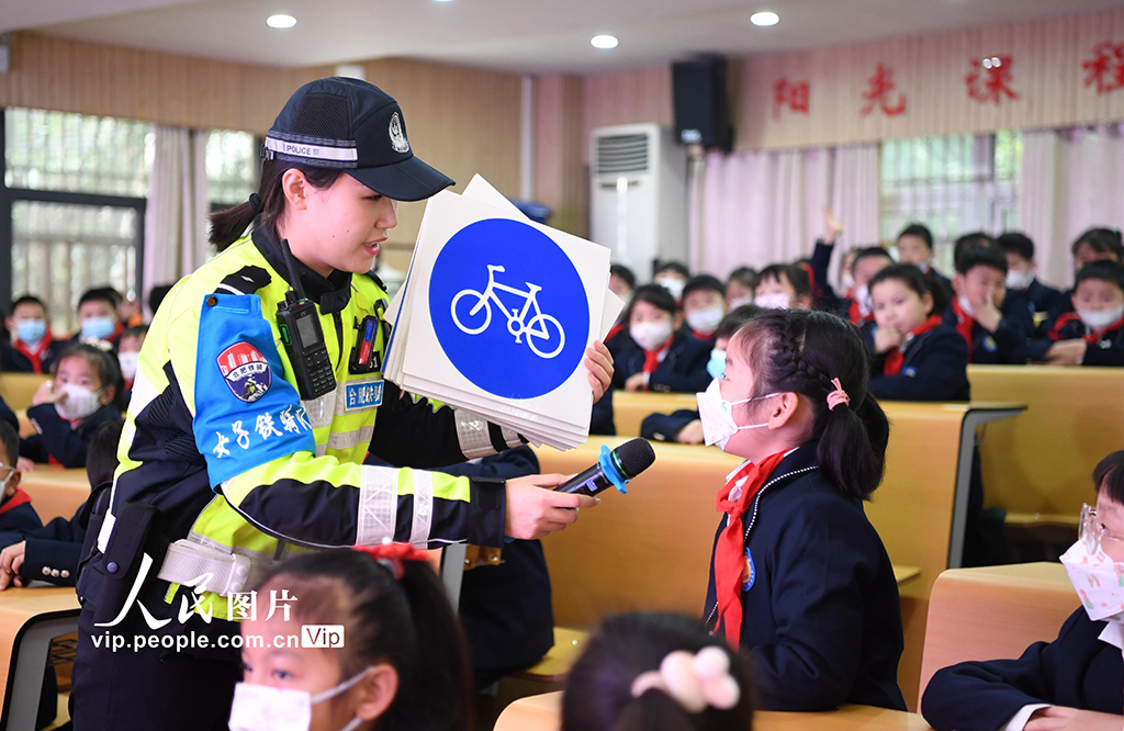 2月6日,安徽合肥中小学春季开学第一天,合肥市公安局交警支队蜀山大队联合女子铁骑队走进辖区小学校园,开展“平安上学路 交警送安全”主题交通安全进校园活动,为学生们讲解交通安全知识。 陈三虎摄(人民图片网)