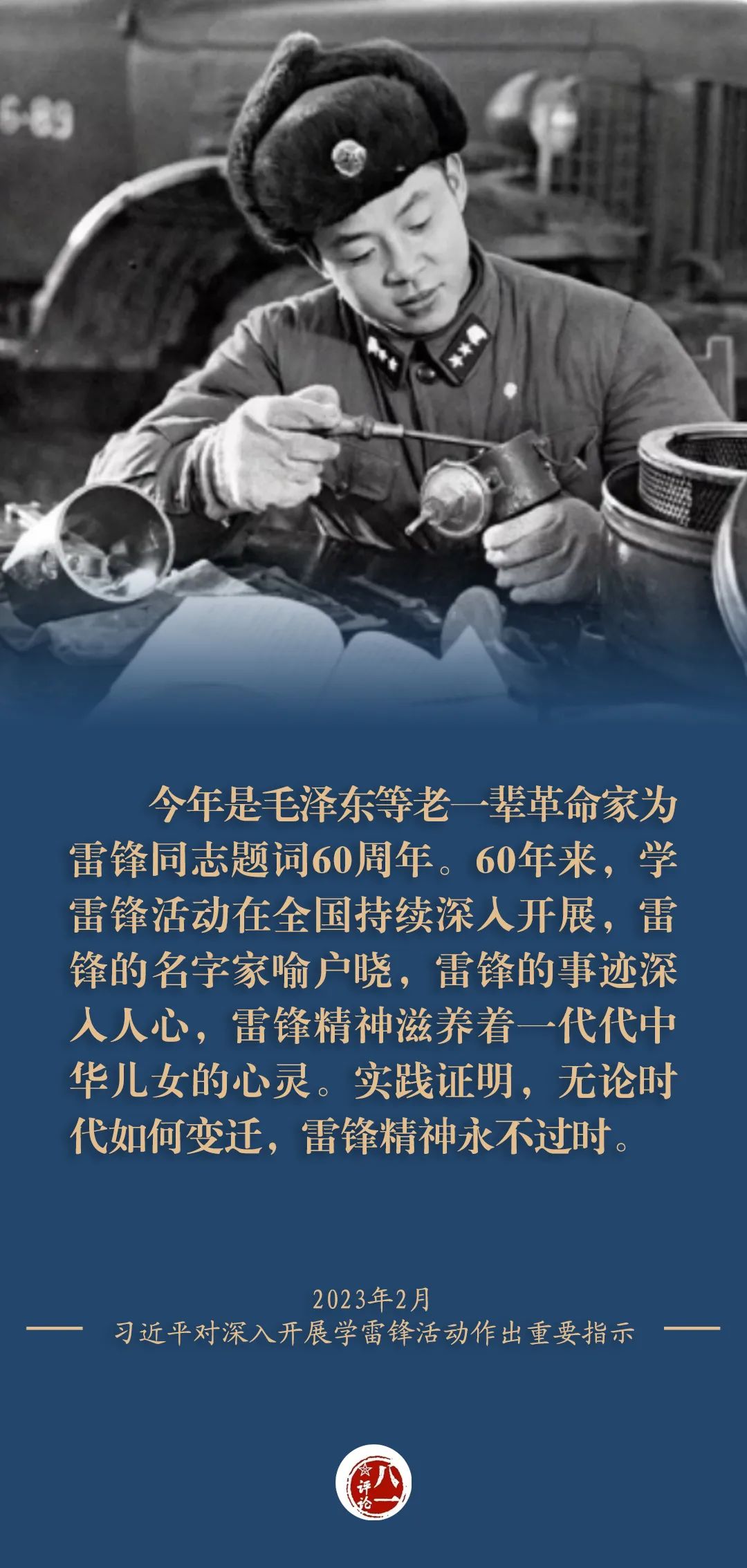 在毛泽东等老一辈革命家题词60周年之际,习近平总书记又专门对深入开展学雷锋活动作出重要指示,强调“无论时代如何变迁,雷锋精神永不过时”,要“让学雷锋活动融入日常、化作经常,让雷锋精神在新时代绽放更加璀璨的光芒”,为新时代更好弘扬雷锋精神指明了方向。