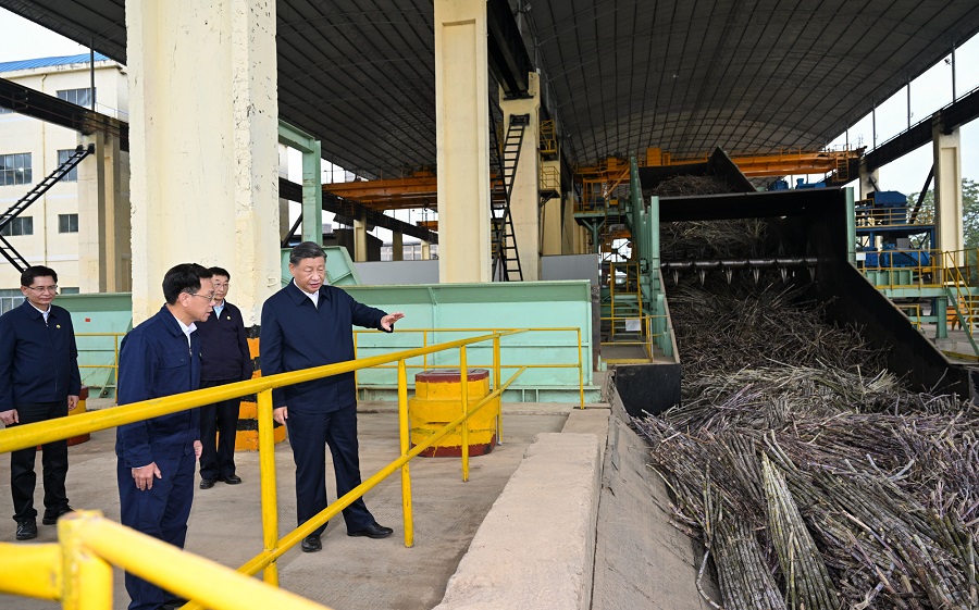 14日下午,习近平总书记在广西来宾市考察调研。他先后来到来宾市国家现代农业产业园黄安优质“双高”糖料蔗基地和东糖凤凰有限公司,了解甘蔗良种繁育、种植收成、糖产业发展等情况。(人民日报记者 徐隽)