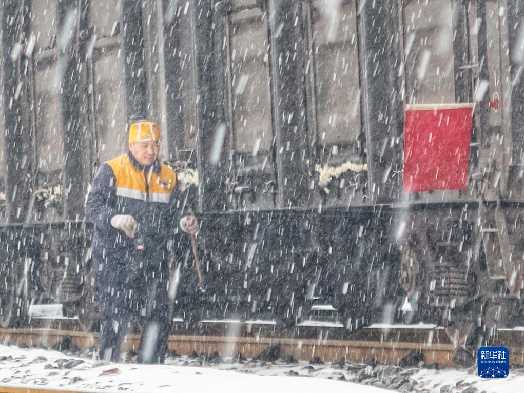 12月14日,中国铁路郑州局集团公司车辆系统职工冒雪检修列车。