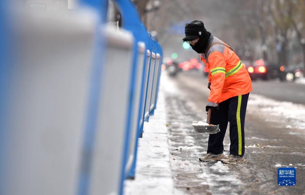 12月14日,河北省石家庄市长安区环卫工在道路上清扫积雪。