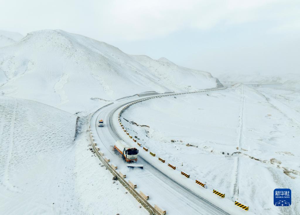 12月14日,在甘肃省酒泉市阿克塞哈萨克族自治县境内,除雪车辆在国道215线当金山路段开展打冰除雪作业(无人机照片)。