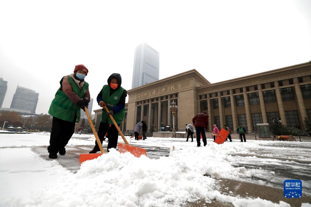 12月14日,园林工人在河北省石家庄市文化广场清扫积雪。