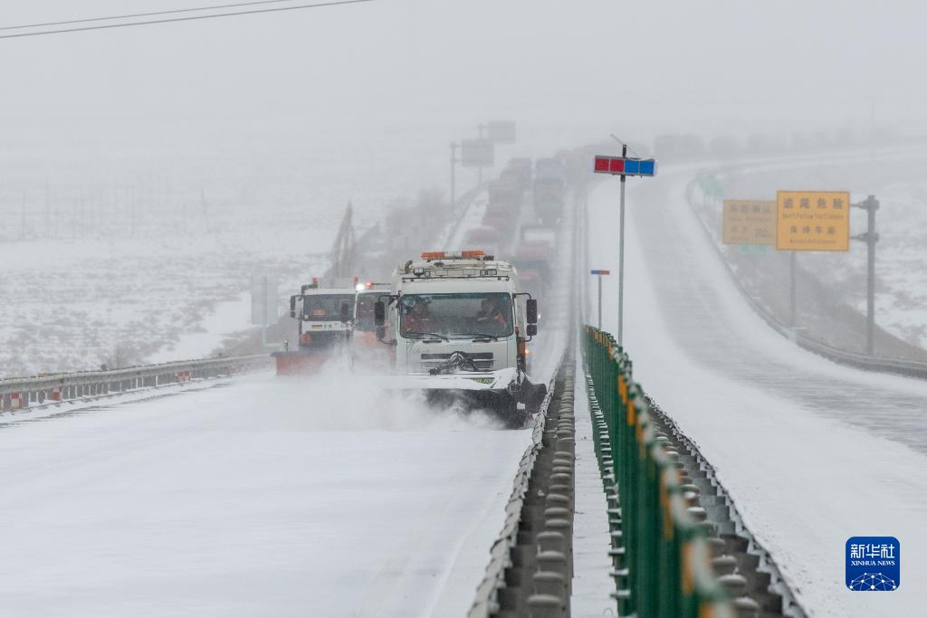 12月14日,甘肃省张掖市公路养护部门在G30连霍高速高台梧桐泉路段进行除雪作业。