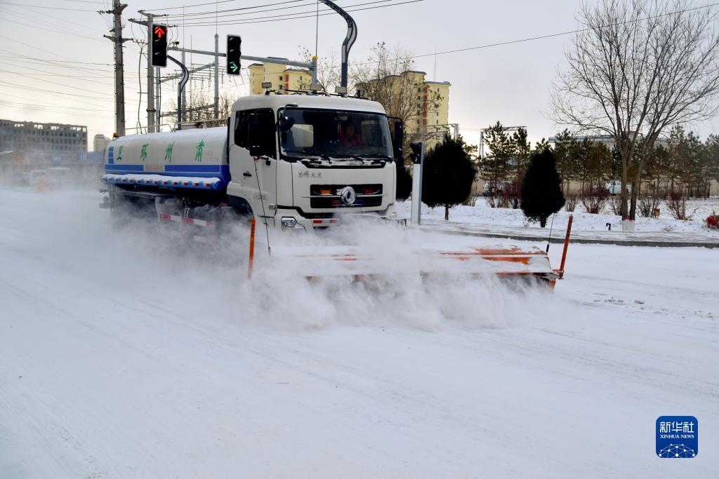 12月14日,一辆道路清雪车在甘肃省酒泉市街头清理积雪。