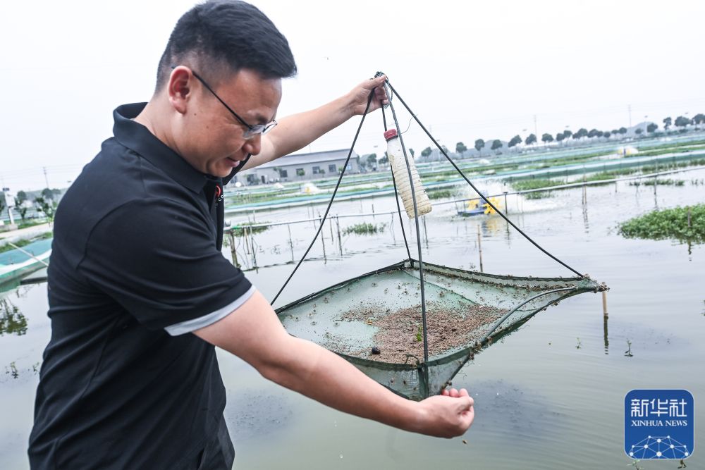 ↑2023年6月1日,栾金祥在浙江省湖州市织里镇湖星农业科技有限公司的湖蟹养殖基地内查看湖蟹的生长情况。栾金祥是美国纽约州立大学硕士毕业,回国后在家乡投身现代农业管理,带动蟹农创收,2022年公司湖蟹养殖销售额达5000万元人民币。