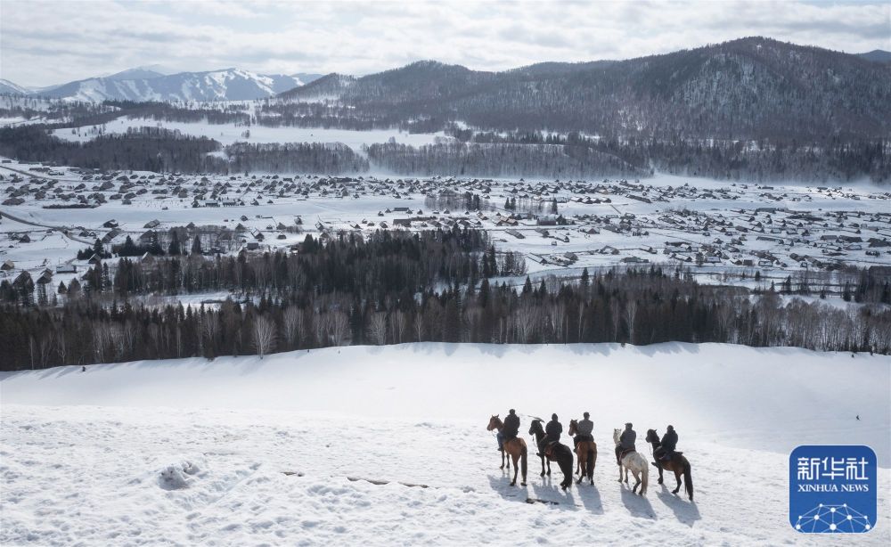 ↑2023年3月30日,新疆阿勒泰地区禾木村观光马队农民专业合作社队员骑马走在禾木村后山的观景平台上,商议未来的发展(无人机照片)。禾木村拥有“中国十大最美乡村”的称号,每年游客络绎不绝,2022年,禾木村村民人均纯收入达4.4万元。目前,这个一千多人的小山村已经拥有22家酒店、169家民宿、19家餐厅和32家商店。参加马队是村民们重要的经济来源之一,每户村民都可以带两匹马参加到马队中来,为游客提供服务。